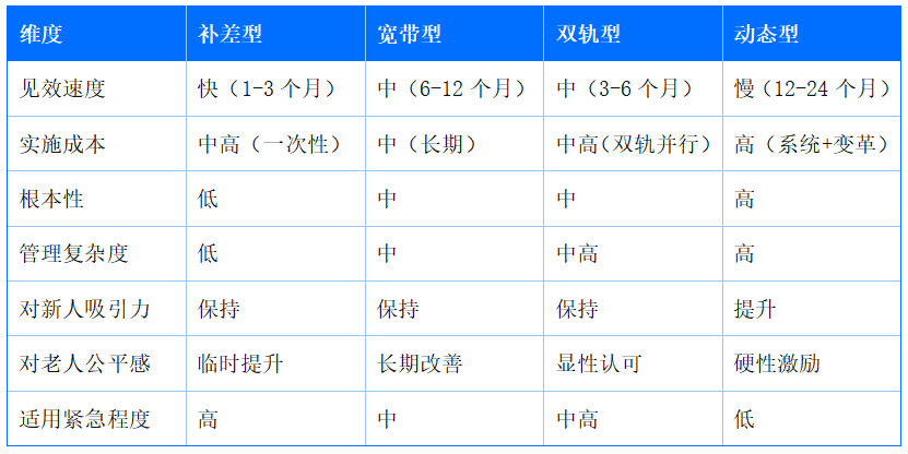 如果倒掛已經(jīng)引發(fā)核心骨干流失、團(tuán)隊士氣崩盤,必須先止血再治病。此時選“補(bǔ)差型”,用3個月時間穩(wěn)定軍心,同時啟動中期方案。